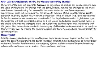 The target audience for a hip hop genre magazine is males aged 16-30, as hip hop appeals more to males, though the genre has broad appeal across ages as it has been around for many years. It will mostly attract males as most artists are male, so women may not have as many female idols. The audience socioeconomic status would be classes D-E as old school hip hop details struggles they can relate to, and many artists came from these classes. Initially, the stereotype was black males in America, but over time hip hop expanded its appeal to other groups while retaining an association with urban fashion accessories.