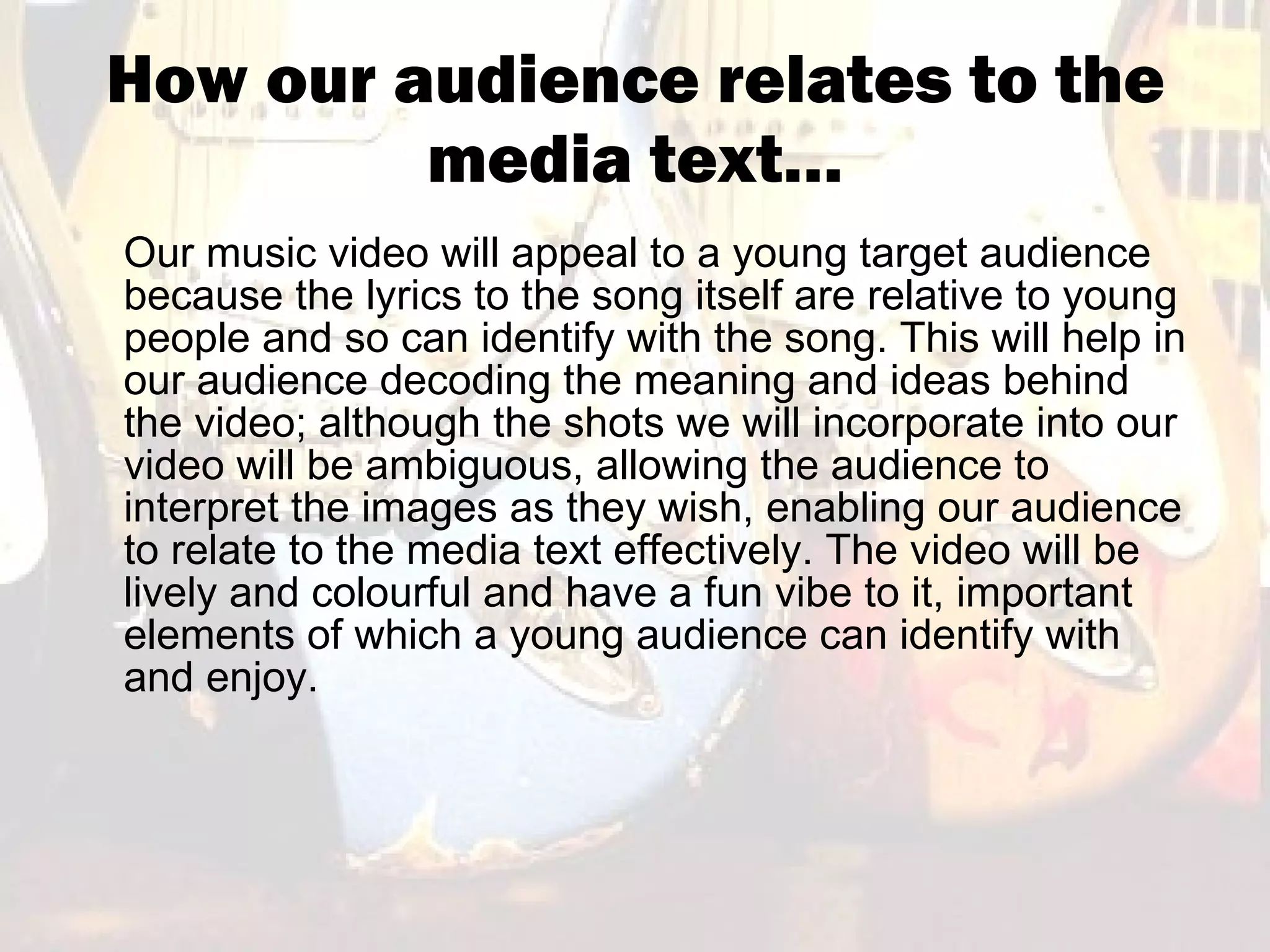 The document summarizes the target audience for an indie rock music video. The audience will be young people aged 14-25 who can relate to the song's lyrics. While the video images will be ambiguous, the lively and colorful style with a fun vibe will appeal to younger viewers. Both female and male viewers in this age range are interested in music, fashion, and culture and often attend live music events.