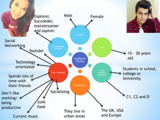This document profiles a target audience of 15-30 year olds in the UK, USA and Europe who are technology oriented and spend lots of time socializing with friends. They are students currently in school, college or university who like current music, social networking and YouTube but dislike working or being productive. Their demographic is C1, C2 and D social economic groups who live in urban areas and have psychographic profiles of Explorer, Succeeder, Mainstreamer or Aspirer.