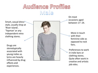 Male indie music fans are typically aged 17-24, dress casually in brands like River Island and Topman or independent retro stores, and have interests in creative or artistic jobs. Female indie fans also tend to be 17-24, are confident expressing emotions and interests in creative arts or retail work, shop at stores like Topshop as well as small retro stores, and enjoy both mainstream and niche music festivals. Drug references are common in indie music lyrics due to influence of drug experiences.