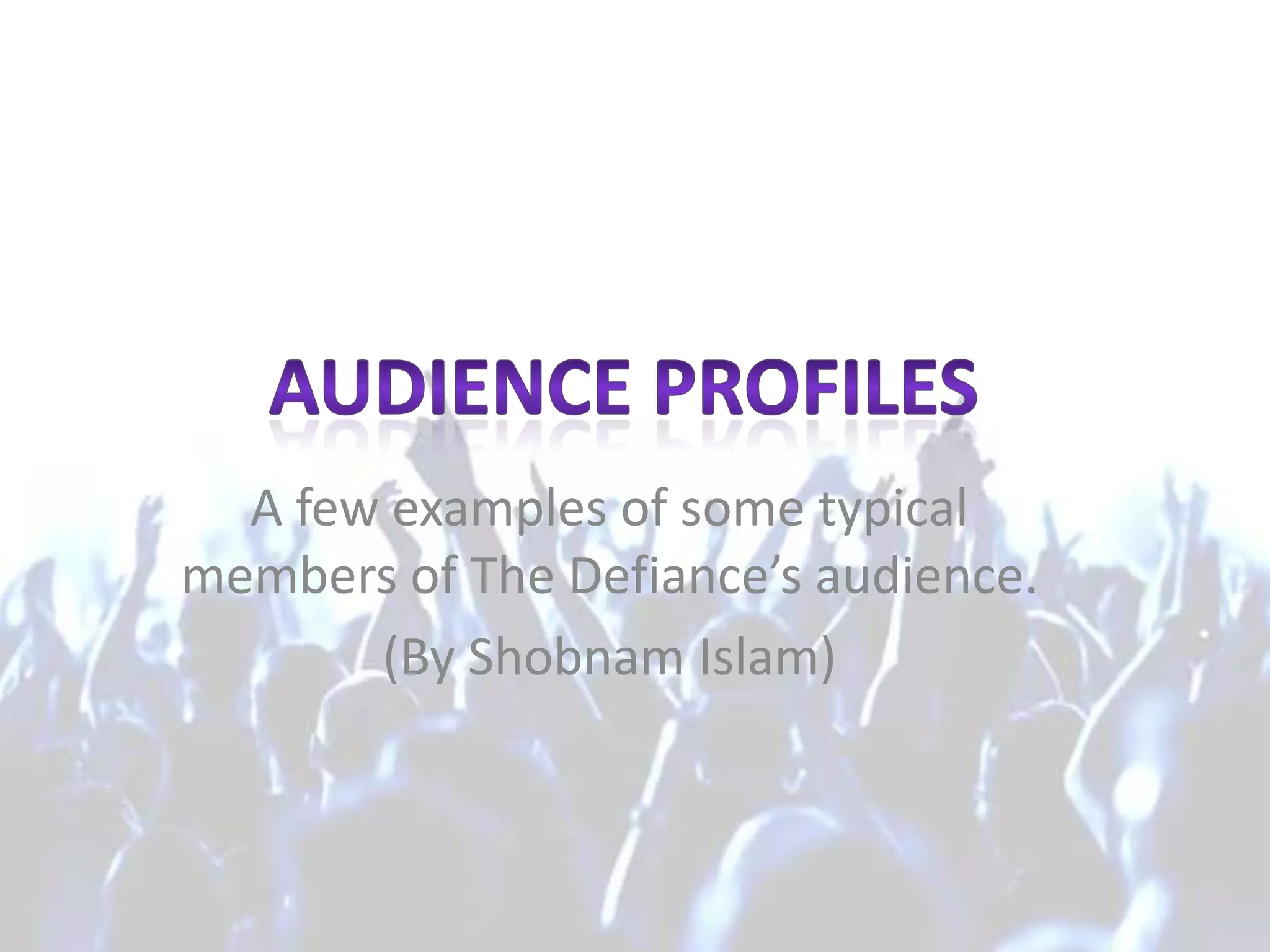 The document profiles 8 potential audience members for the band The Defiance, describing their backgrounds, occupations, interests, and why the band might appeal to each persona. It includes personas such as an 18-year old student studying art, a 20-year old music intern, a 25-year old employed woman, and a 29-year old married father.