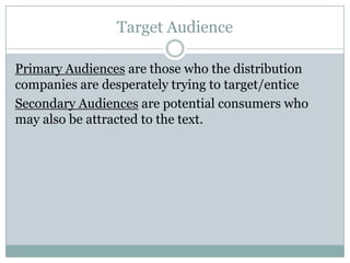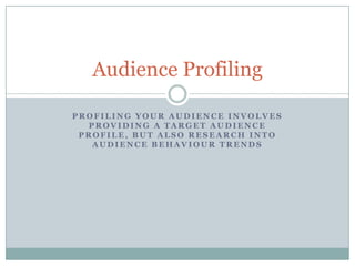 This document discusses audience profiling methods for magazines. It explains that profiling involves defining the target primary and secondary audiences as well as understanding audience behavior trends. The document outlines three common methods for classifying audiences: demographic profiles which consider factors like age, gender, location; psychographic profiles which group people by attitudes and values; and lifestyle subsets which identify subcultures based on shared interests. Understanding these audience segments helps magazines effectively engage and attract readers.