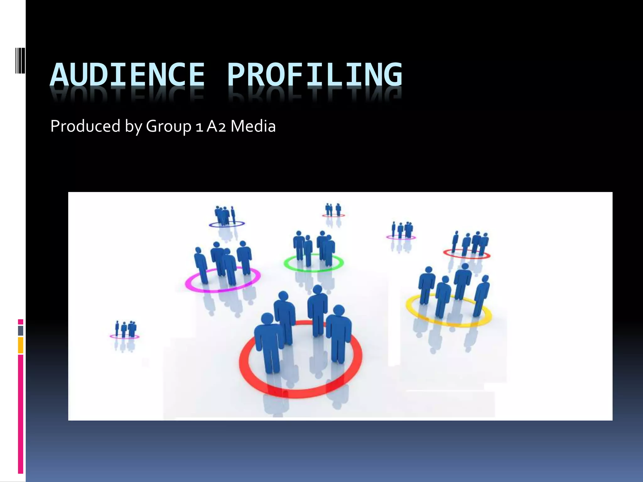 This document discusses audience profiling for media products. It explains that when creating a product, companies profile audiences by considering factors like age, gender, education, income and interests to target the right demographic. Demographics are broken into groups like professionals, managers and manual workers. Psychographics examine behavior and personality to understand why audiences use media. The document then profiles the target audience for a music video as young students seeking new experiences. It plans to promote the video on social media which this audience uses more and create additional media products to widen awareness of the artist.