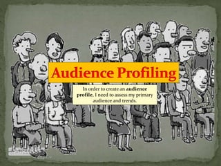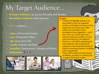 The document outlines the target audience for a regional magazine as 35-55 year old males and females from an upper middle/middle class income bracket in Yorkshire, UK. It describes this audience as affluent, sophisticated, and having free time to read. The magazine will focus on topics like homes, gardening, and fashion to appeal to both genders. Research on an existing successful Yorkshire magazine called "Living North" provided examples of formats and conventions to attract a similar target readership.