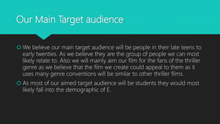 The document discusses the target audience for a thriller film. The primary target audience is people in their late teens to early twenties, particularly students, as the creators can most relate to this demographic. Additionally, the film aims to appeal to fans of the thriller genre by utilizing common conventions. Psychographic research indicates the target audience falls into the mainstream and reformer categories, who are generally conformist and open to new ideas, respectively. The purpose of the film is entertainment rather than information or personal identity.