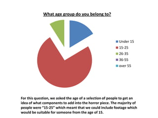 The document is a questionnaire given to audiences to help inform the creation of a horror trailer. It asks questions about demographics (age, gender), preferences (scariest aspects, favorite locations), and behaviors (how often they watch horror movies, use the internet to find films). The majority of respondents were between 15-25, found the unknown the scariest, and preferred fast action in trailers. This provided guidance on what to include to appeal to target audiences for the horror trailer.