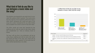 This document analyzes the results of a questionnaire given to an audience about their preferences for a music video. The questionnaire covered topics like whether the video should match the mood of the song, use a narrative or visual style, include actors similar to the target audience, appropriate settings and outfits, use of color, day vs night filming, repetition, and more. The analysis found that a visual video shot at night featuring blue/purple colors and changing locations would best suit the "dark" and "strange" electronic song based on audience responses. It confirmed the producer's initial ideas while providing new details to consider for an effective music video that appeals to the target audience.