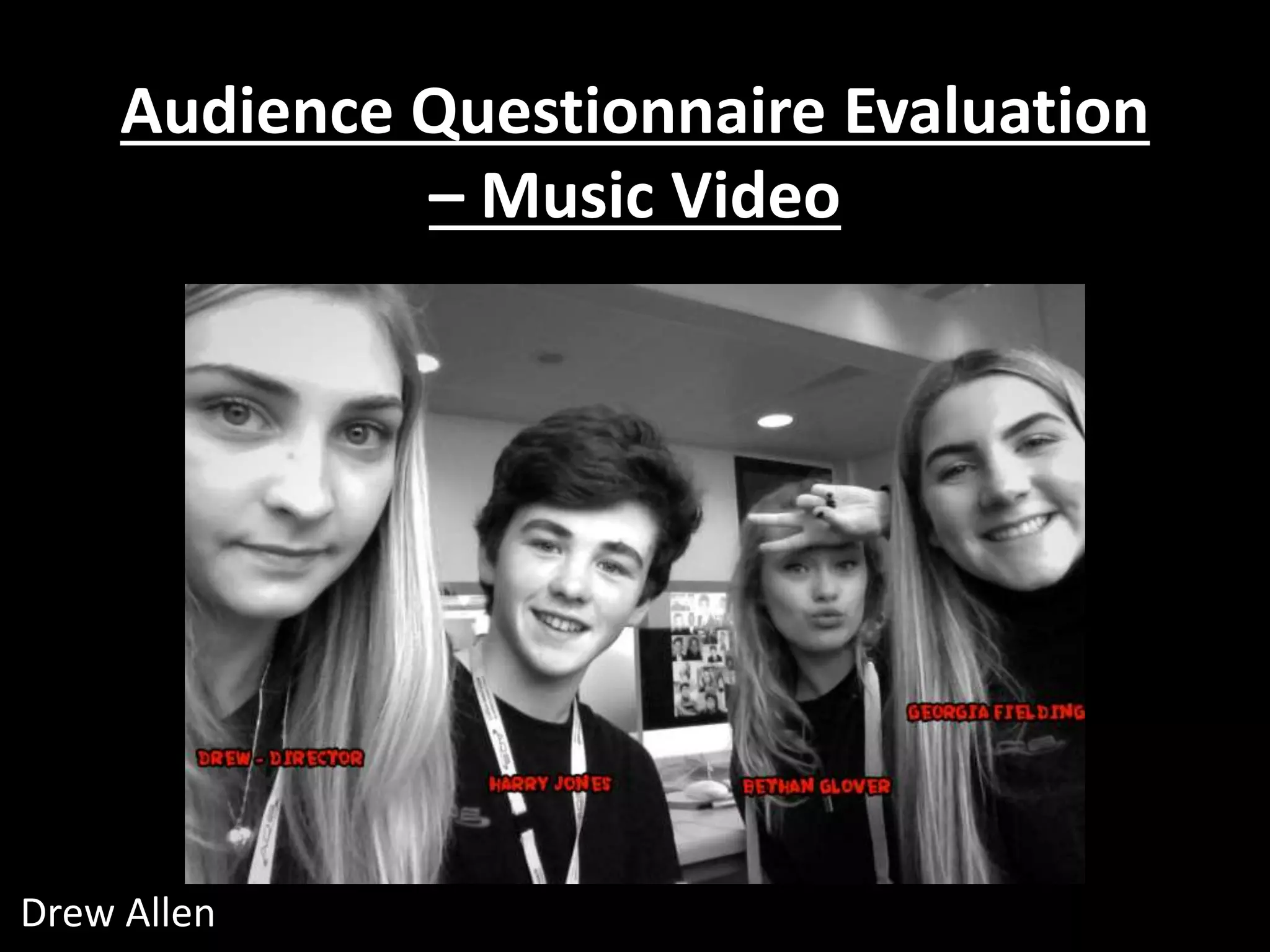 The document is a summary of the results from a questionnaire about audience preferences for a music video. It discusses demographic questions about age and gender. Most respondents were male and aged 26+. Subsequent questions addressed preferred clothing, lighting, camera shots, props, narrative/lyrical style, effects, dance routines, settings, lip syncing, and relationship to lyrics. The document analyzes the conclusive results and how they will influence design choices for the music video.