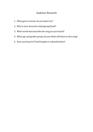 This document contains questions for audience research about music preferences, including the genre and artists they enjoy, descriptions of a song, and awareness of specific musicians. It asks respondents about their music tastes, opinions on a song, and demographic information like age and gender to understand the target audience for a musical work.