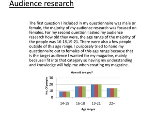 The document discusses the results of audience research conducted to inform the creation of a new music magazine. It provides details on the questions asked, including about demographics, music interests, purchasing habits, and preferred magazine content. The majority of respondents were females aged 16-21 who enjoy pop music and would pay £2-3 for a monthly magazine featuring interviews and articles about well-known bands.