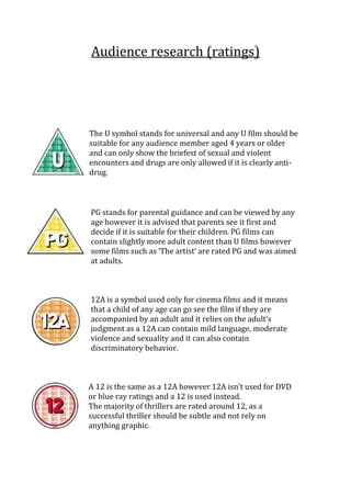 U films are suitable for all ages 4 and over and can only briefly show sexual/violent content or anti-drug messages. PG means parental guidance is advised as films may contain slightly more adult themes. 12A means children of any age can attend with an adult and contains mild language, violence, and sexuality. 15 ratings allow more graphic violence, language, sexuality, and drug use but can't promote or encourage harmful behaviors. 18 ratings are for adults only and can include very strong language, violence, sexual content, and themes not suitable for minors. The document discusses creating an 18 rated thriller to fill a gap in the popular but less common 18 rated thriller genre.