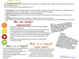 This document provides information about vegetarianism and veganism. It defines vegetarians as those who do not eat meat, fish, or animal products that cause harm to animals. Vegans are defined as those who do not eat any animal products, including dairy and eggs. A typical vegan meal may include foods like tofu, nuts, chickpeas, rice, lentils, soy and oat milk. Some reasons why people choose a vegetarian diet are concerns about animal welfare, health benefits, environmental impacts, and religious beliefs. The document also provides statistics about vegetarian demographics in the UK and US.