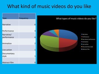 This document discusses audience research on music videos, asking what kind of music videos people like, if science goggles could become fashionable, and how people access music videos as well as what elements people find essential in a music video.