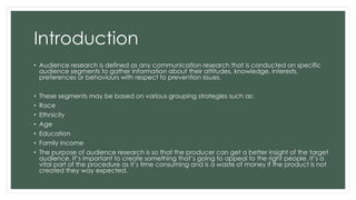 This document discusses audience research methods used to better understand target audiences. It describes conducting research on audience segments based on demographics like age, income and education to learn their attitudes and behaviors related to issues. Audience measurement panels track online and mobile media usage. Television audience measurement provides reliable viewership data. Nielsen measures global TV viewing and accounts for viewers engaging with multiple platforms. Research methods discussed include surveys, interviews and analyzing ratings, psychographics and demographics to classify audiences.