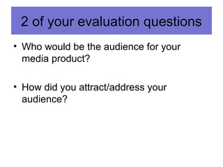This document discusses conducting audience research for media products. It provides information on measuring audiences through demographic profiles that include factors like gender, age, income level. It also discusses psychographic profiles that examine lifestyle, attitudes and media consumption. The document outlines different audience segments classified by their values, aspirations, and responses to advertising appeals. These include mainstreamers, aspirers, succeeders, reformers, and individuals. It also discusses using a target audience grouping system to categorize audiences based on surveys of attitudes and behaviors. The goal is to help media producers better understand their target audiences.