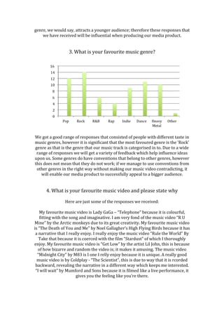 The document summarizes findings from a survey about audience preferences for rock music videos. It found that the target audience is mostly female aged 16-20 who enjoy the rock genre. Respondents said their favorite music videos have compelling narratives and band performances. Most watch music videos to escape reality and feel rock videos should follow conventions like dark colors and band performances. The survey shows people want rock videos to include both narrative and performance elements. This information will guide the creation of a new rock music video that appeals to this target audience.