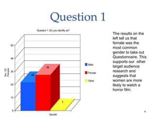 The audience research survey indicates that female participants, aged 15-34, are the primary demographic interested in horror films, preferring male leads and closeness in age with protagonists. While psychological horror was favored over torture horror, a mixture of ingredients like spontaneous actions, mystery elements, and dark lighting were suggested to enhance engagement. Overall, the results emphasize the importance of relatability, complexity, and music in creating an effective horror trailer.