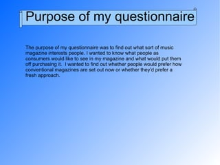 The document summarizes the results of a questionnaire about preferences for a new music magazine. It found that respondents preferred to see both male and female artists on the cover, wanted more facts and exclusives rather than interviews, and would like to receive a CD as a free gift. The majority also said they would purchase the magazine fortnightly and that £1-£1.50 would be a fair price.