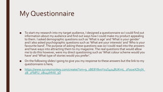 The document discusses research conducted to understand the target audience for a rock music magazine. A questionnaire asked about demographics like age and gender, and interests like hobbies and favorite bands. Most respondents were males aged 15-18 who enjoyed masculine hobbies and bands like Fall Out Boy. They preferred the layout and color scheme (red, yellow, black, white) of popular magazine Kerrang. Focus groups confirmed the target audience wants articles on gossip and exclusives, and competitions included in the magazine. The research summary is that the magazine should aim at teenage males, feature male rock bands, use a sans-serif font and colors of white, black, yellow and red, and take design cues from Kerrang.