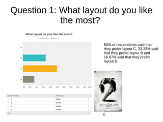 An audience survey was conducted for a poster with 10 questions. For layout, 50% preferred C and 33.33% preferred B. For the title, 50% preferred the bottom and 33.33% the top. For content, responses were split so the group will decide. For camera shot, 50% preferred an extreme close up and 33.33% a mid close up. For the tagline, 33.33% said top but 66.67% said bottom so the group agrees with bottom or just above/below the title. For color, 83.33% chose red, white, and black but the group prefers green, white, and black. For background, 50% chose dark and 33.33%