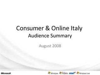 - The document provides an analysis of consumer internet usage in Italy in August 2008 based on Nielsen NetRatings (NNR) data.
