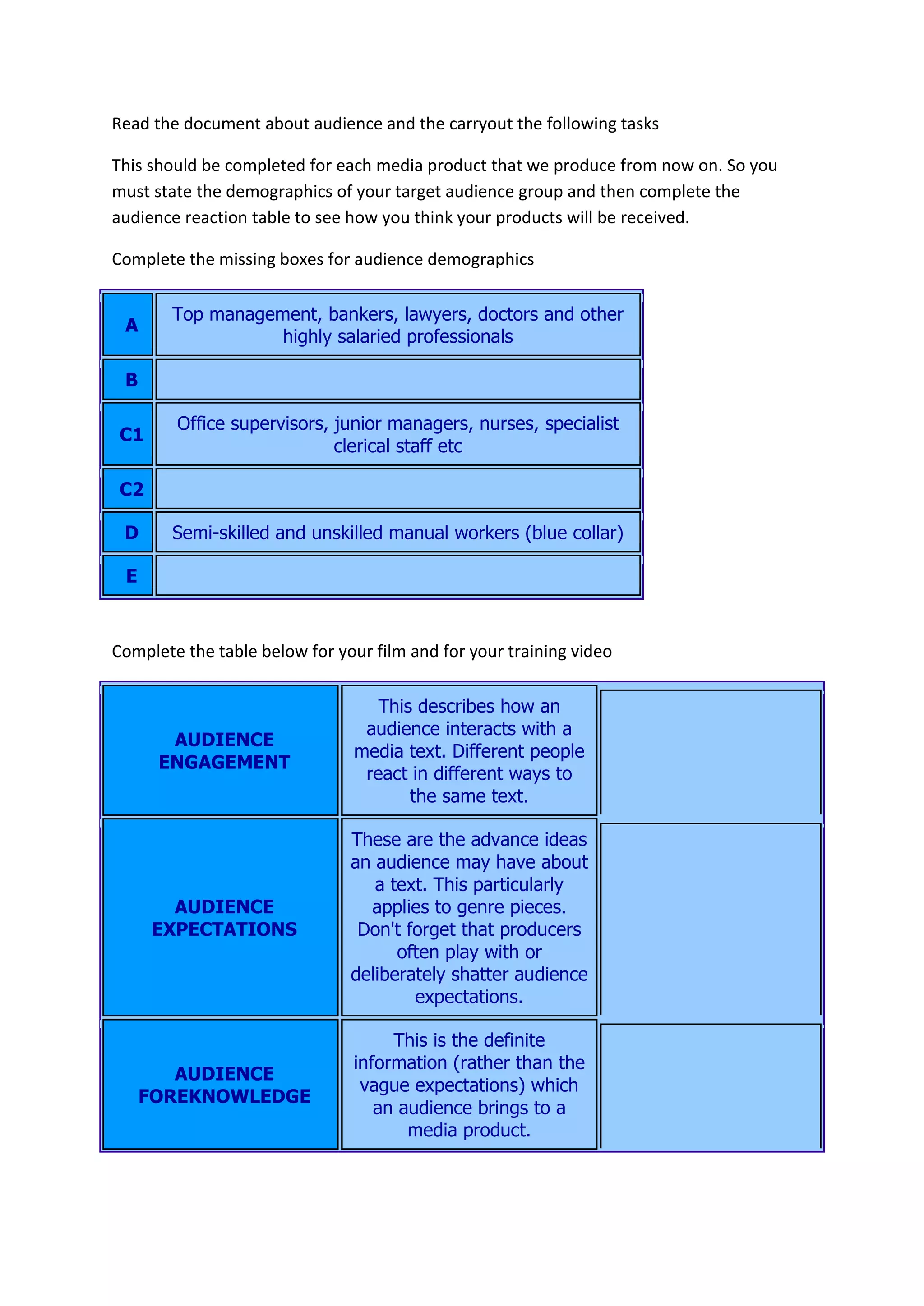 The document provides instructions for completing an audience analysis for media products. It includes a table to characterize the demographics of the target audience using categories A through E. It also includes an audience reaction table to assess how the target audience will engage with, have expectations of, bring prior knowledge to, identify with, and find the product placed for them. Completing this audience analysis is important for each new media product.