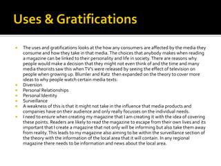 The document discusses several media theories relevant to creating a magazine, including uses and gratifications theory, utopian theory, two-step flow theory, and hypodermic needle theory. It emphasizes that an effective magazine should fulfill readers' needs for diversion, personal relationships, identity, and surveillance. It also notes the importance of allowing readers to escape from reality through idealized content while still providing real local news and information. Accounting for individual reader characteristics and creating an understanding between publisher and audience through shared codes and conventions is also highlighted.