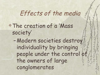 The document discusses several theories about the effects of media on audiences: