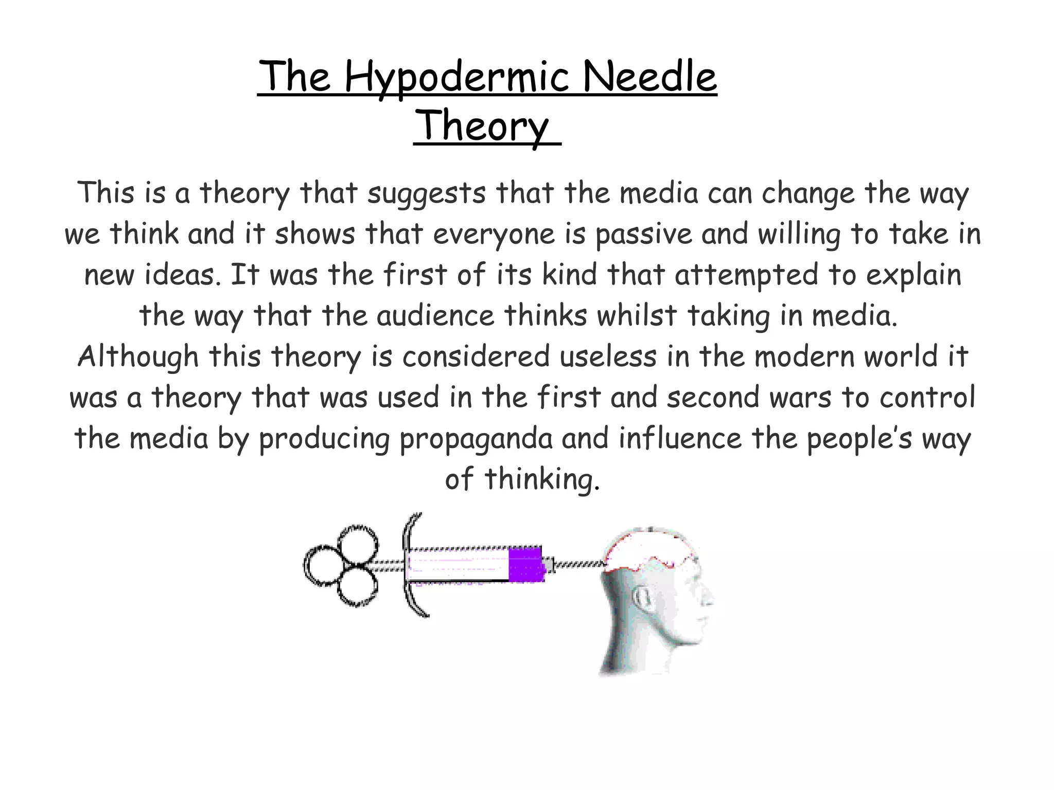 1) The Hypodermic Needle Theory suggested media could passively change audiences' thinking, but it is now seen as too simplistic.