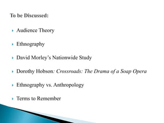 This document discusses audience theory and research in British cultural studies. It summarizes David Morley's influential study from 1980 where he had different socioeconomic groups watch an episode of Nationwide and analyzed their interpretations. It also discusses Dorothy Hobson's research on the soap opera Crossroads, which took a more ethnographic approach than Morley by observing viewers in their own homes. Key concepts discussed include dominant, negotiated, and oppositional readings; how audiences construct meaning differently based on social position; and differences between ethnography and anthropology as research methods.