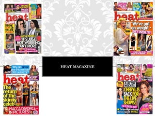 Heat magazine is a weekly entertainment magazine published in the UK by Bauer Media Group since 1999. It focuses on celebrity news and gossip targeting female audiences. Bauer Media Group is a large, privately-owned German publishing company that dominates several sectors of the magazine industry. Heat has expanded over the years through new platforms like its website and social media accounts, allowing it to engage audiences daily with breaking news stories and behind-the-scenes content. The magazine also promotes Bauer Media's other brands like radio stations and magazines to further monetize its readership.