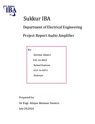 The project report details the design and analysis of a multistage audio amplifier using bipolar junction transistors (BJTs) to achieve higher gain and input/output flexibility. It discusses the operation of the common emitter amplifier, including biasing, phase inversion, and the influence of load resistance on gain. Simulation and implementation aspects emphasize the benefits of multistage design over single stage amplifiers, while challenges such as clipping and noise are also noted.