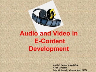 This document discusses the use of audio and video in e-content development. It defines multimedia and audio/video, noting their significance in capturing interest and contributing to learning. Advantages for learners include control over pace and selective reading. The document outlines objectives like scripting and manipulating sound waves for audio work. It recommends tools like Audacity for recording and editing audio, and Any Video/Audio Converter for converting formats. Finally, it provides exercises for using Audacity's audio editing features.