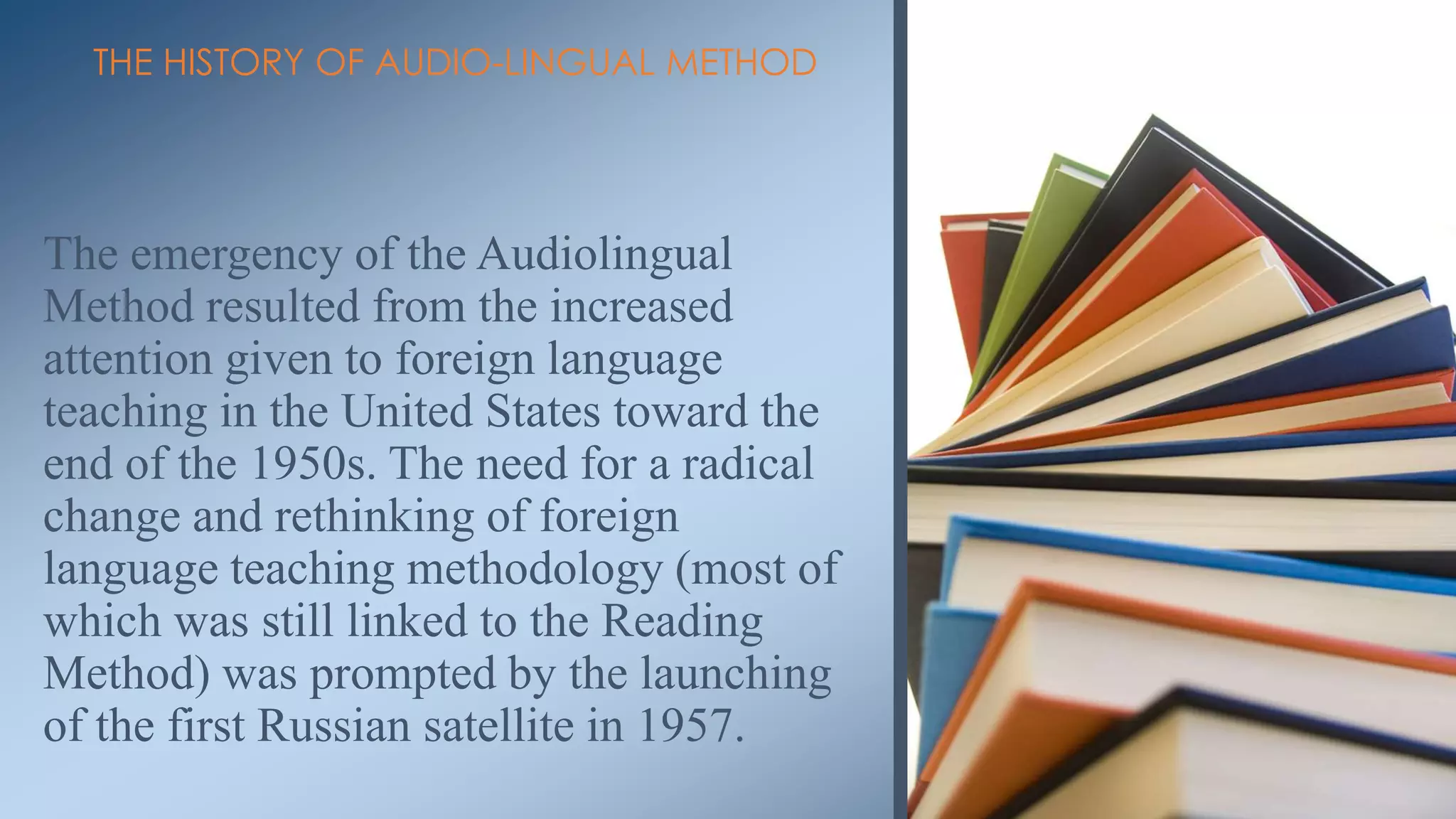 The Audiolingual Method emerged in the late 1950s in response to the need to improve foreign language teaching in the US. It drew on linguistics, behaviorism, and the Army Language School's approach. The method focuses on oral proficiency through repetition and pattern drills without explanation. Students are expected to mimic the teacher and avoid using their native language. Interaction is teacher-directed with an emphasis on habit formation to learn grammar implicitly.