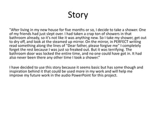 The story explores an unsettling presence in a family's new home through disturbing events and messages left for the father. Strange noises, writing, and the appearance of the man's son all contribute to building an ominous atmosphere.