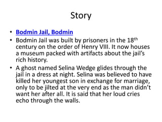 Selina Wedge was a 28-year-old single mother in 1878 Cornwall who drowned her youngest son Henry in exchange for marriage to James Westwood. However, Westwood did not want her after all. Selina was convicted of murder and hanged at Bodmin Jail, where her ghost is said to haunt the prison crying and trying to reach out to children. Her tragic story and execution have left her spirit lingering at the jail where she met her unfortunate end.