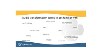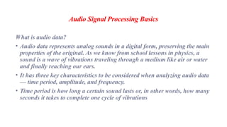 The document covers the fundamentals of audio signal processing, detailing the characteristics of audio data, various file formats, and essential features like spectrum and cepstrum. It also discusses applications of audio analysis, including speech, voice, music, and environmental sound recognition, as well as tools and technologies utilized in these processes. MATLAB's Mirtoolbox and Voicebox are highlighted as resources for audio processing, with insights into voice recognition efficiencies and challenges.