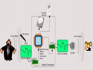 The document provides a comprehensive overview of sound systems, including components like microphones, sound cards, and speakers, and the principles of sound signal conversion between analog and digital formats. It discusses the functionalities and types of sound cards, wireless microphones, audio quality measures, and the technologies used in wireless audio transmission. Additional details include various types of speakers, their specifications, and advantages and disadvantages of wireless audio equipment.