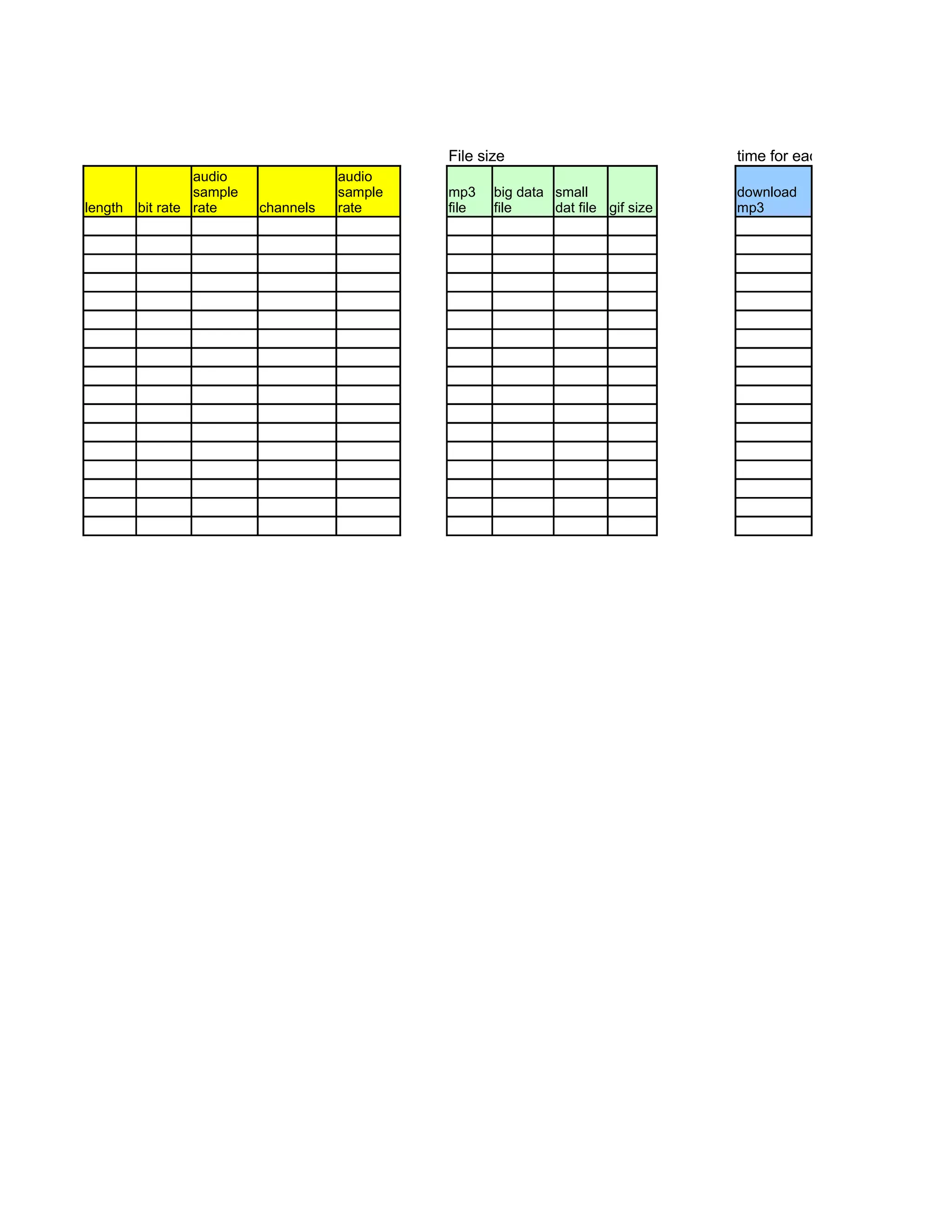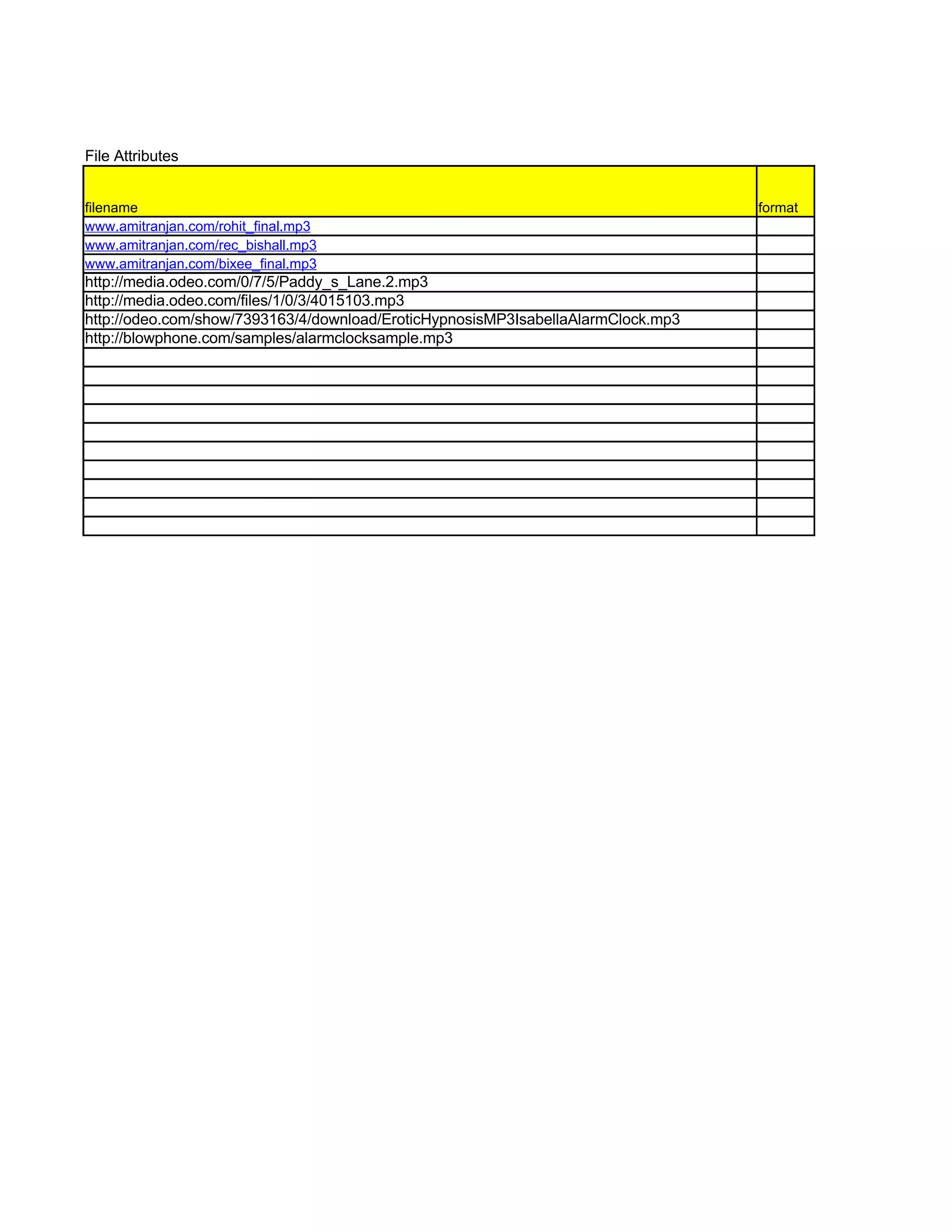 This document contains a list of 75 audio files with their associated URLs and metadata like length and format. The files include podcasts, music, and other audio content from various sources on the internet. Key information provided includes the file URL, length, and source for each audio recording.
