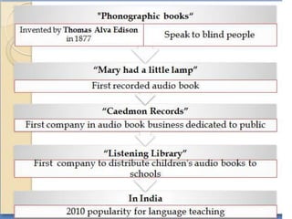 The term "talking book" originated in the 1930s with government programs created for blind readers, which established the "Talking Books Program". In the 1970s, the term "audiobook" came into use as audiocassettes replaced record players. Audiobooks are available in many formats including records, cassette tapes, CDs, MP3s, and downloadable digital files, and are preloaded on hardware devices. They provide benefits such as increased comprehension, independence, and improved language and vocabulary skills which make them useful for blind individuals as well as second-language learners, those with learning disabilities, and struggling readers.
