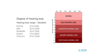 This document provides an overview and interpretation of audiograms, tympanograms, and hearing tests. It discusses different types of hearing loss, including conductive, sensorineural, and mixed hearing loss. Examples of various audiograms demonstrating different hearing conditions are presented. Causes, clinical findings, and diagnoses for different hearing loss patterns are also reviewed. Common hearing tests like the Weber test and Rinne test are described.