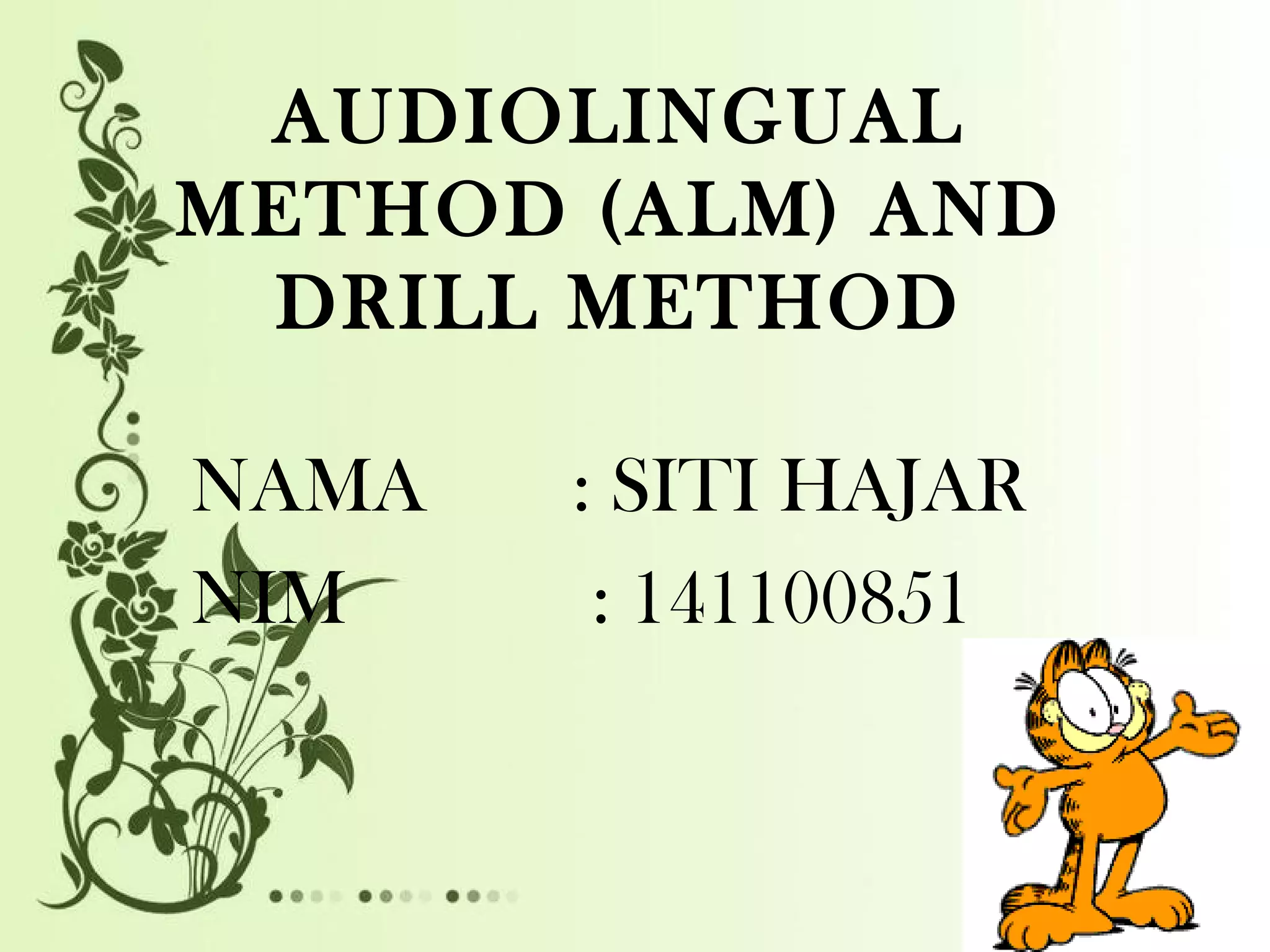 The audiolingual method emphasizes teaching listening and speaking before reading and writing. Its main goal is to enable students to communicate in the target language. Some key principles are that language learning involves habit formation, students should give correct responses rather than mistakes, and aural-oral training provides a foundation for other skills. Advantages include the ability to speak communicatively and understand lessons in the native language. Disadvantages are a lack of spontaneous speaking, limited student participation, and little attention to content or communication. Drill methods involve exercises to acquire skills through motor or mental repetition and association building.