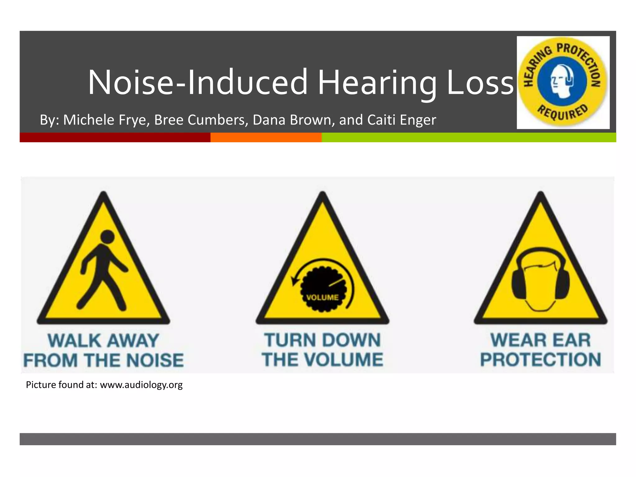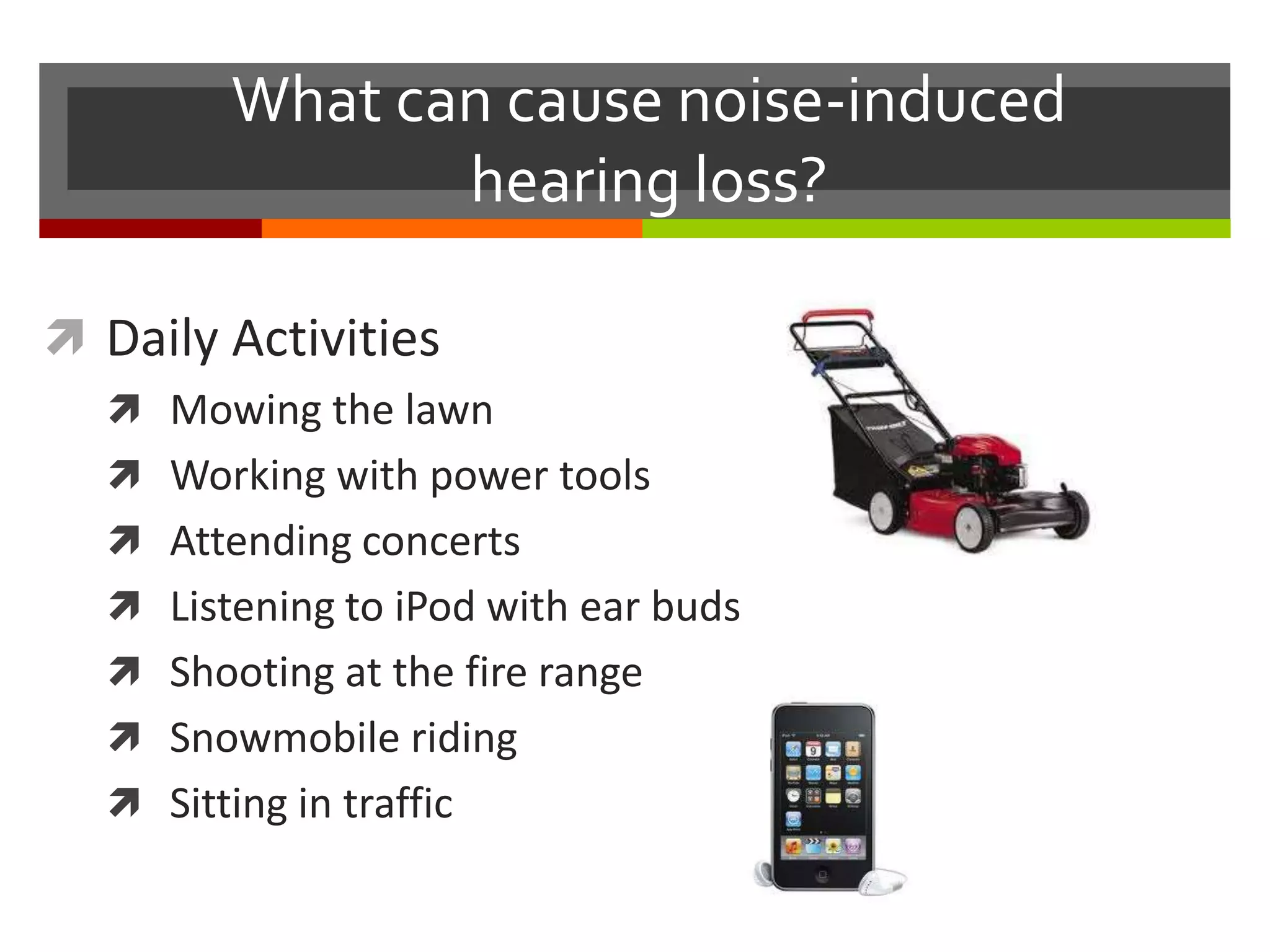 Daily activities like mowing the lawn, attending concerts, and certain occupations like factory work, farming, and the military can expose individuals to noise levels that can cause noise-induced hearing loss over time. NIHL is preventable if proper precautions are taken such as wearing hearing protection during loud noise exposure, turning down music players, and walking away from loud noises when possible. Resources are available to learn more about identifying dangerous noise levels and finding treatment options for any resulting hearing loss.