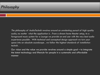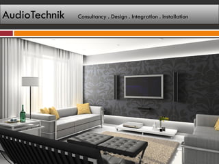 AudioTechnik is an audio consultancy and installation company focused on high quality audio experiences. They provide consultancy, design, integration, and installation services for home theaters, high end audio systems, architectural acoustics, and home automation. Their philosophy is to pursue the best possible audio quality through technical and conceptual design, and to integrate the latest affordable technologies.