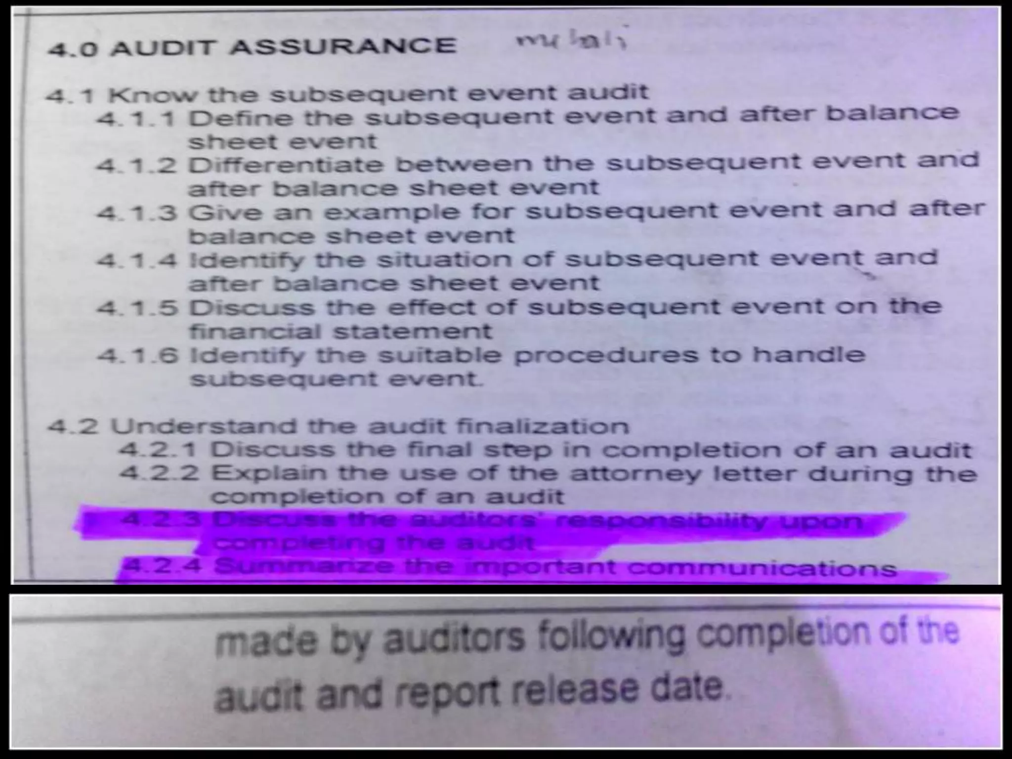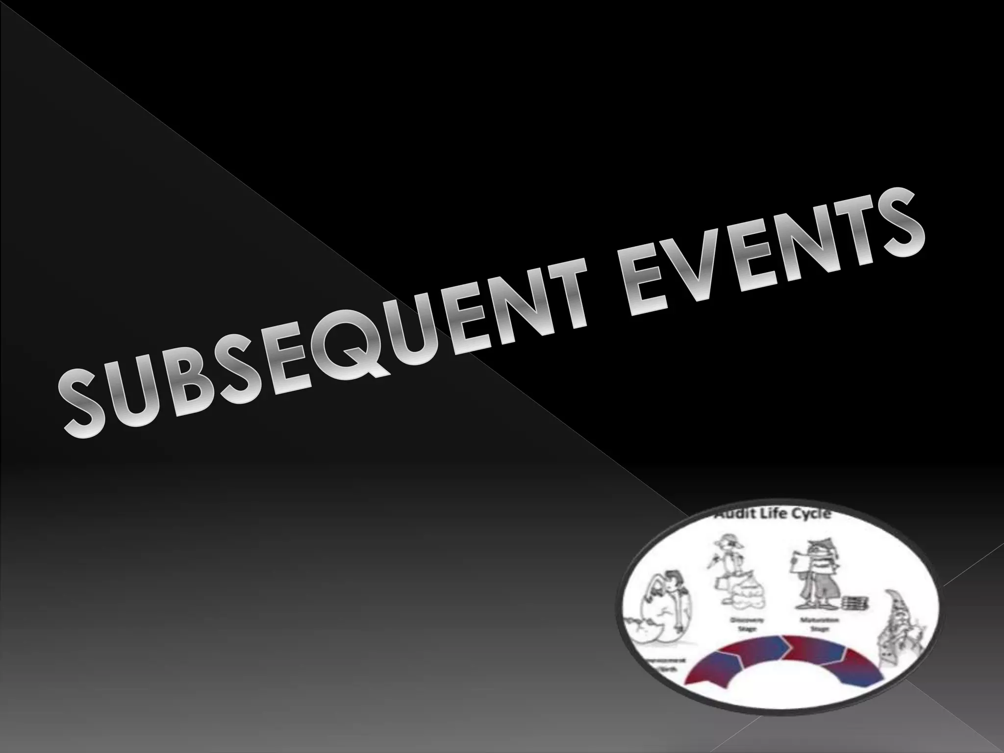 This document defines and compares subsequent events and after balance sheet events. It discusses the differences between them, provides examples of types of each, and outlines the auditor's procedures to identify subsequent events. It also reviews audit working papers, evaluates audit results, and ensures proper disclosures and compliance. The document describes communications between the auditor and client, including engagement letters, attorney response letters, and management letters.