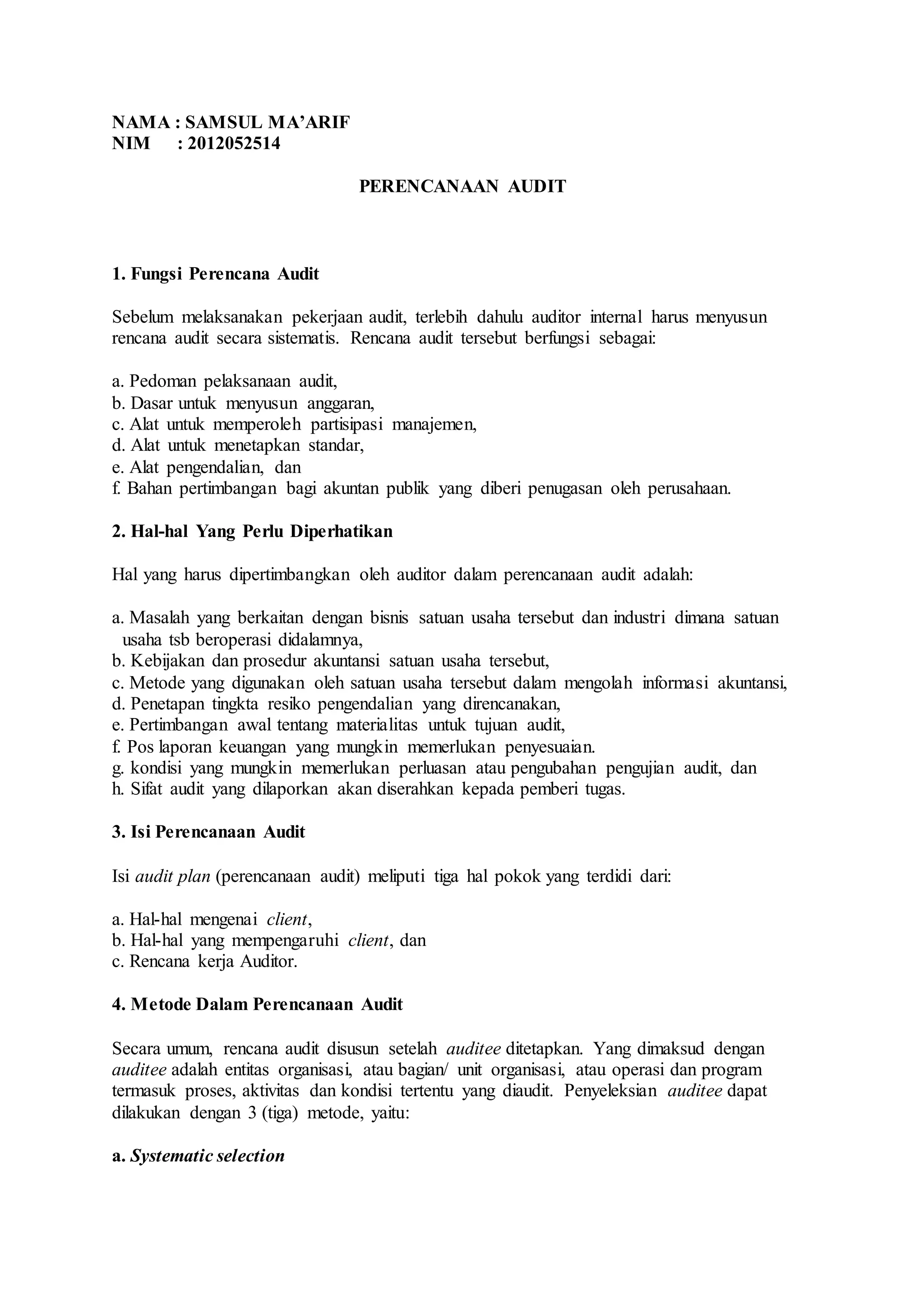 Perencanaan audit merupakan langkah penting sebelum melaksanakan audit untuk menentukan ruang lingkup, tujuan, dan prosedur audit. Hal ini dituangkan dalam program audit yang mencakup informasi mengenai auditee, pengendalian yang ada, dan prosedur audit. Program audit perlu disusun dengan mempertimbangkan risiko agar fokus pada hal-hal penting untuk mencapai tujuan audit.