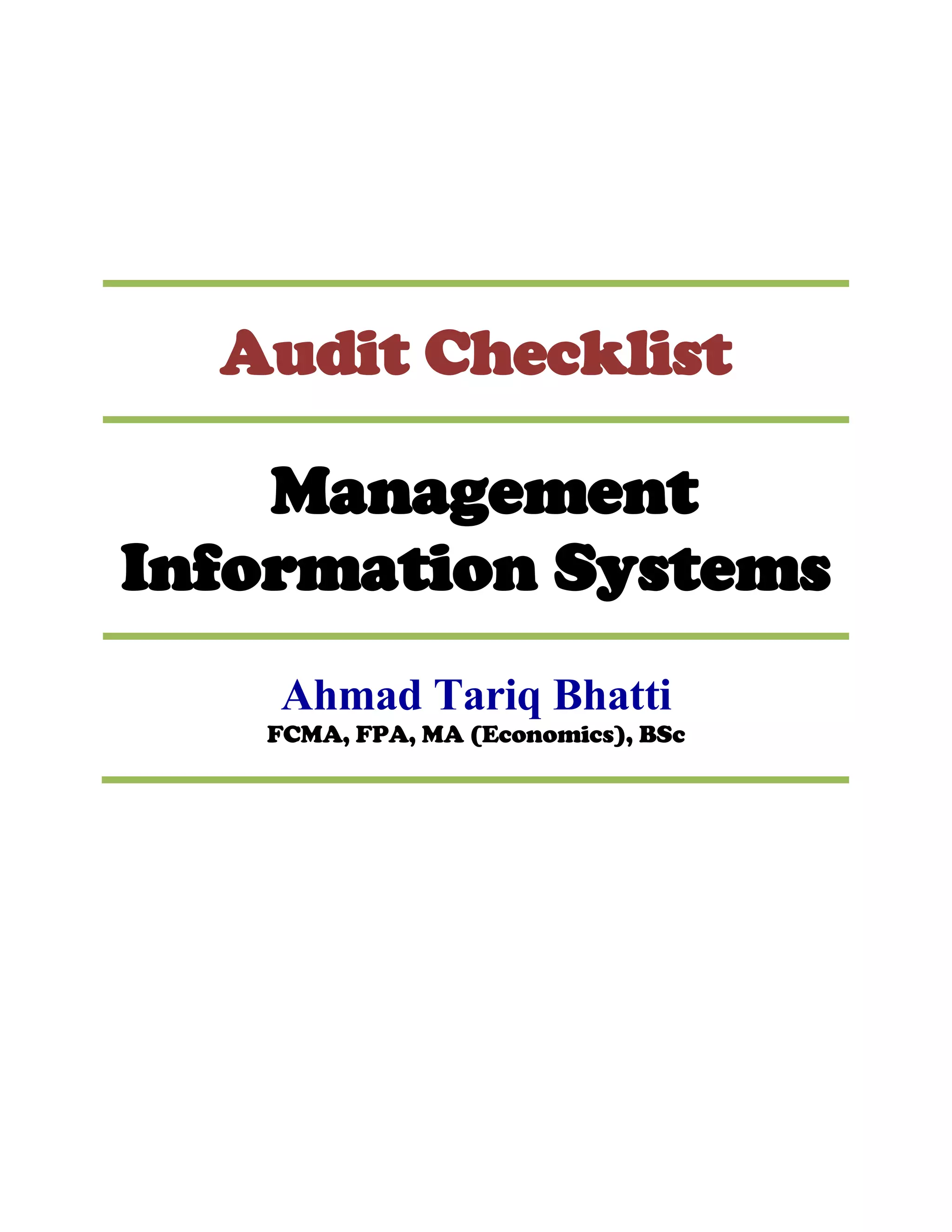 The document presents a comprehensive audit checklist for management information systems, focusing on various aspects such as organizational structure, program maintenance, system development, data access, and security controls. It outlines specific audit objectives, procedures, and standards to ensure adequate segregation of duties, proper authorization of changes, and effective data security policies. Additionally, it addresses continuity of operations and personnel policies related to the management of information systems.