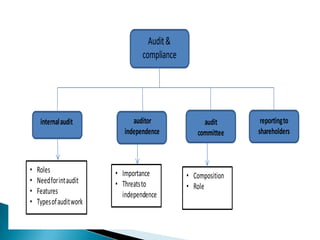 The document discusses the roles and responsibilities of internal auditors and audit committees. It notes that internal auditors review controls, compliance, operations, and risks. They ensure controls are working properly and in accordance with laws and regulations. The audit committee oversees the internal audit function and monitors financial reporting, controls, and compliance. It reviews internal and external audit reports and the company's internal control statement. The committee helps provide assurance to shareholders that risks are adequately managed and controls are functioning effectively.