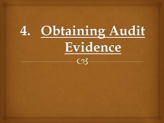 The document discusses audit evidence and procedures for gathering evidence. It defines audit evidence and its basic principles of independence, integrity, and objectivity. It describes the sources of audit evidence, including physical examination, confirmations, documentation, analytical procedures, inquiries, reperformance, and observation. It discusses factors like audit risk, reliance on controls, materiality, and reliability that influence evidence. It also covers the appropriateness, relevance, reliability, and direction of testing for audit evidence. Finally, it discusses substantive procedures used to detect material misstatements.