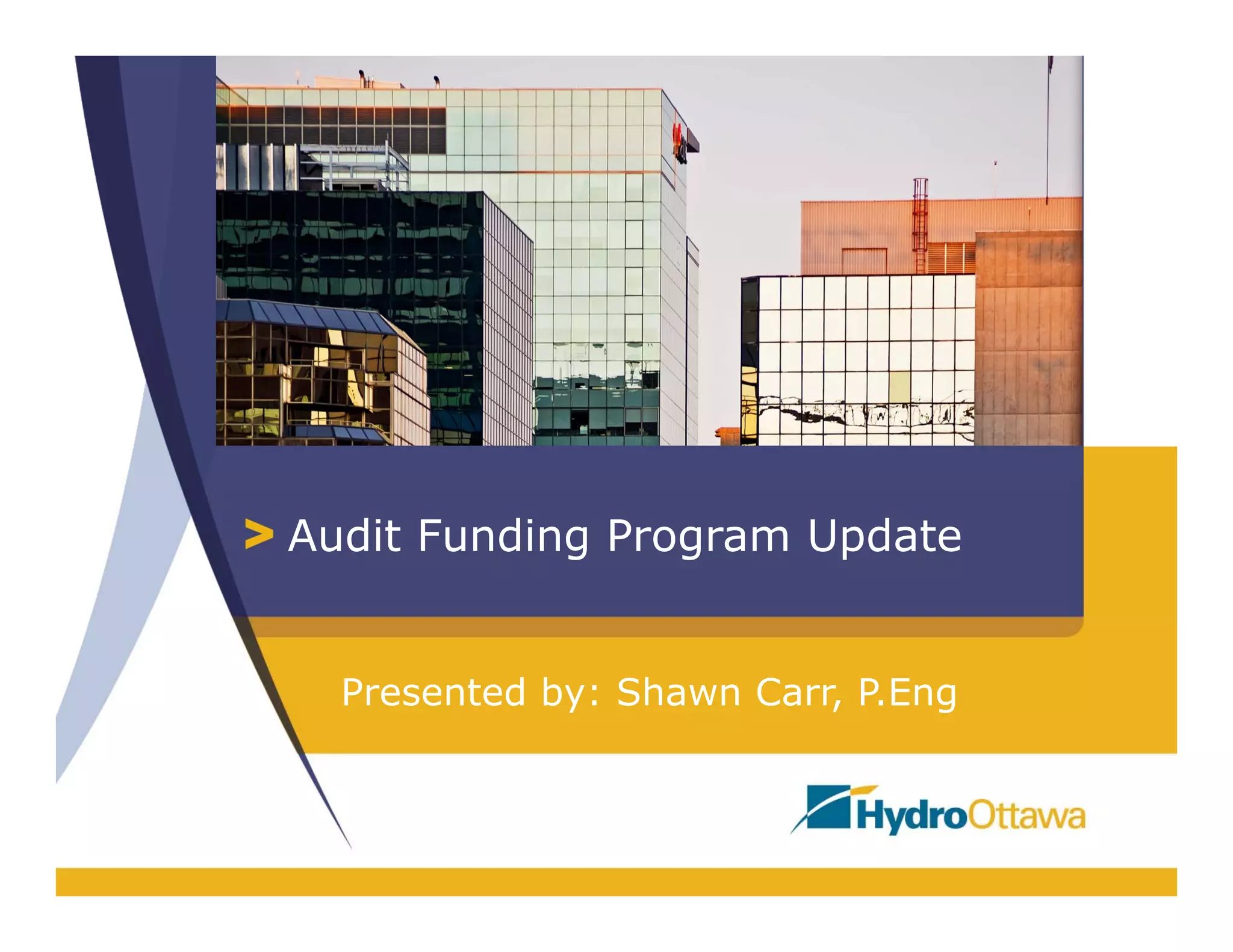 The audit funding program aims to improve energy efficiency by providing financial incentives for energy audits and system optimizations for both building owners and tenants. This includes varying levels of support based on building size and audit type, targeting a 400 GWh energy conservation goal by 2020. Changes being considered for 2016 may broaden the scope of commissioning services and adjust the analysis for capital modifications.